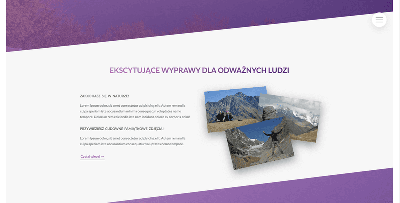 Podróże to strona typu Landing Page z interaktywnymi elementami. Strona jest responsywna, czyli działa dobrze na dużych ekranach, tabletach oraz smartfonach. Posiada menu typu 'hamburger', które jest zawsze dostępne podczas przeglądania zawartości całej strony.